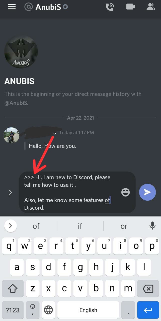 Example: If you want to quote an entire paragraph, let’s say, “Hey, I am new to discord, please tell me how to use it and what are its features,” then you will need to follow the following format :